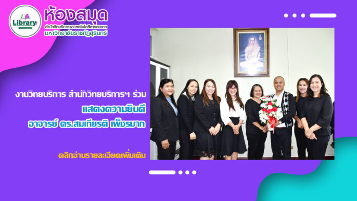 NewsSlideข่าวประชาสัมพันธ์ภาพกิจกรรม งานวิทยบริการ ร่วมแสดงความยินดีในโอกาสได้รับแต่งตั้งดำรงตำแหน่ง ผู้อำนวยการสำนักวิทยบริการฯ 13 มกราคม 2026 4 วันที่ 13 มกราคม 2569 บุคลากรงานวิทยบริการ มอบช่อดอกไม้แก่ อาจารย์ ดร.สมเกียรติ เพ็ชรมาก ผู้อำนวยการสำนักวิทยบริการฯ เพื่อแสดงความยินดีในโอกาสได้รับแต่งตั้งดำรงตำแหน่ง “ผู้อำนวยการสำนักวิทยบริการและเทคโนโลยีสารสนเทศ