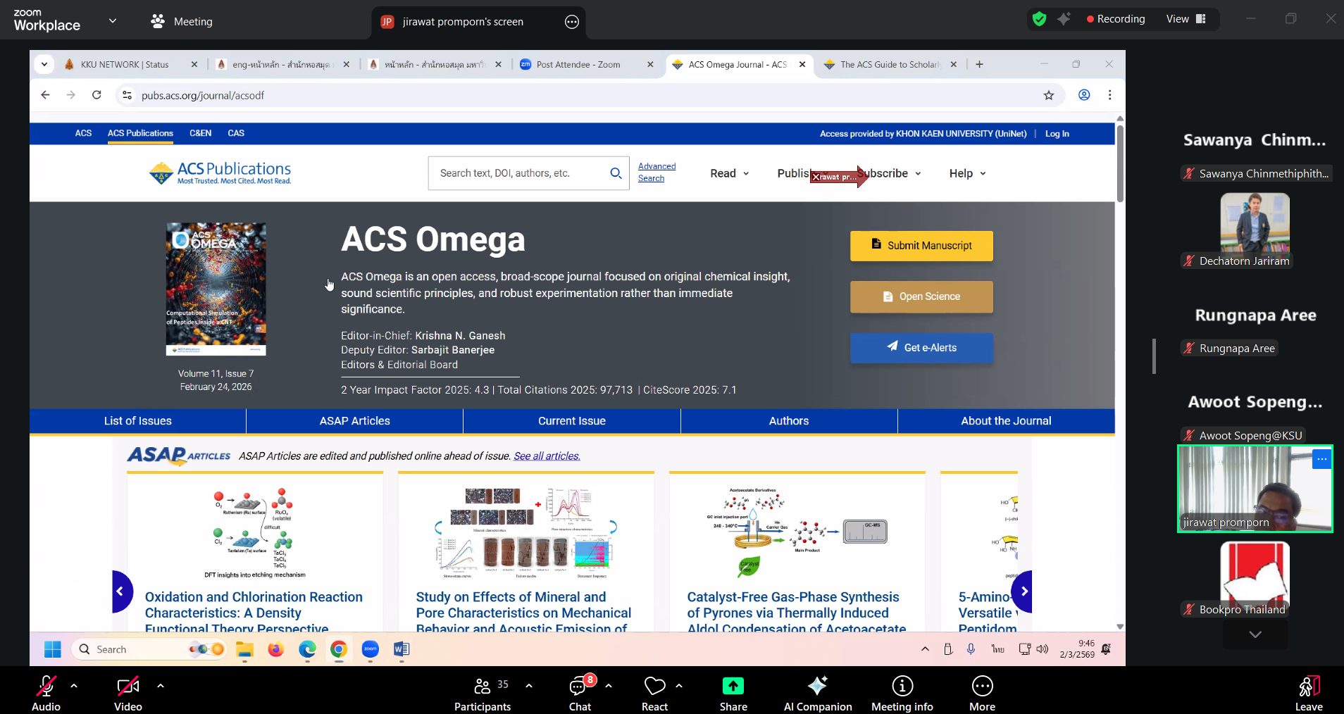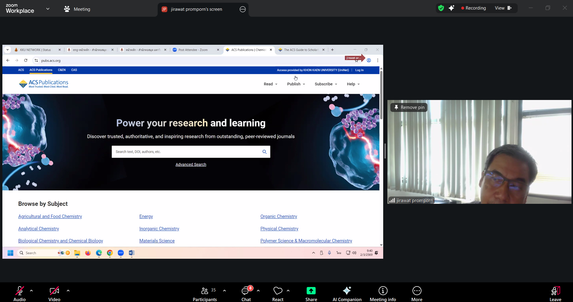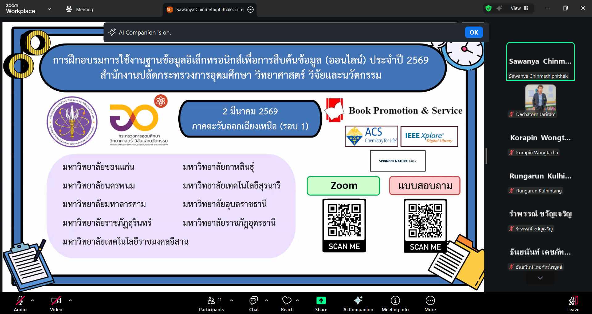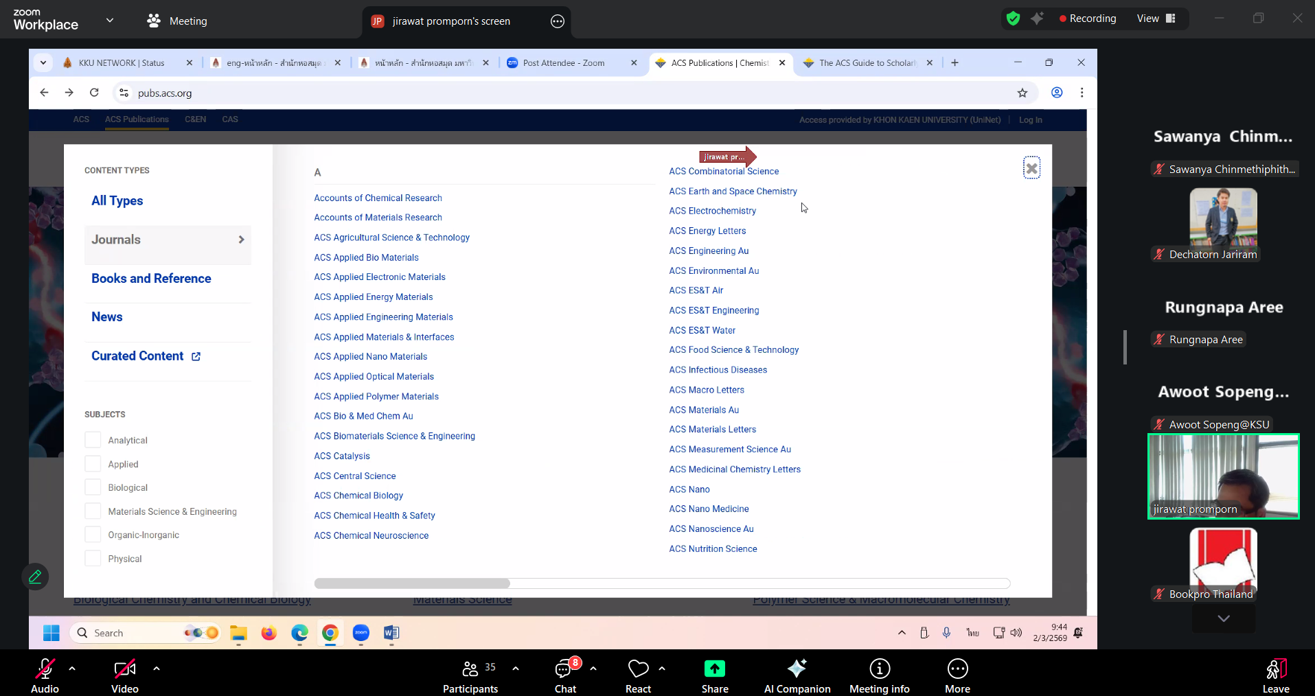 วันที่ 2 มีนาคม 2569 งานวิทยบริการ สำนักวิทยบริการและเทคโนโลยีสารสนเทศ โดย นางสาวลัทธวรรณ แพงเจริญ หัวหน้างานวิทยบริการ นางพัชรี จุลหงษ์ ตำแหน่งบรรณารักษ์ นายเดชาธร จะริรัมย์ ตำแหน่งบรรณารักษ์ และนางสาวอภิญญา เค้ากล้า ตำแหน่งบรรณารักษ์ เข้าร่วมการฝึกอบรมการใช้งานฐานข้อมูลอิเล็กทรอนิกส์เพื่อ การสืบค้นข้อมูล (ออนไลน์) ประจำปี 2569 สำนักงานปลัดประทรวงการอุดมศึกษา วิทยาศาสตร์ วิจัยและนวัตกรรม ผ่านออนไลน์ด้วยโปรแกรม Zoom Meeting โดยมี คุณจิรวัฒน์ พรหมพร บริษัท บุ๊ค โปรโมชั่น แอนด์ เซอร์วิส จำกัด เป็นวิทยากรให้ความรู้ จำนวน 2 ฐานข้อมูล ได้แก่ (1) ฐานข้อมูล American Chemical Society Journal (ACS) (2) Springer Nature Link